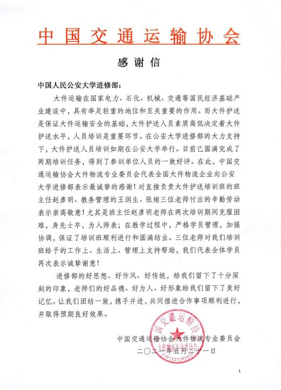 中国交通运输协会大件物流专业委员会发来感谢信