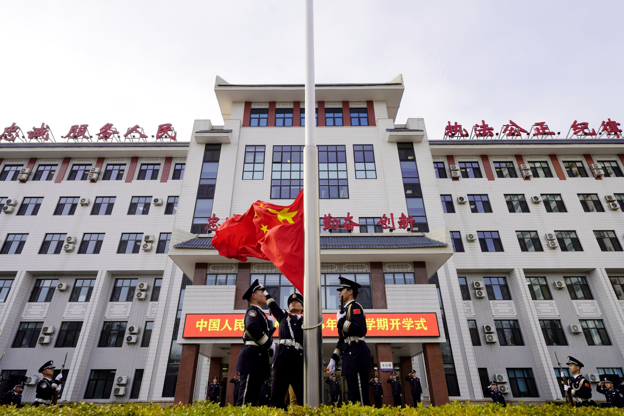 开学式上,举行了隆重的升国旗仪式。研究生院2023级侦查专业硕士研究生窦文涛、本科新生院副院长赵雅彬分别发言,表达了“为党育人、为国育才、为警铸剑”的坚定决心和“请党放心,强国有我”的青春担当。校属各单位班子成员和3000余名师生代表共同参加开学式。