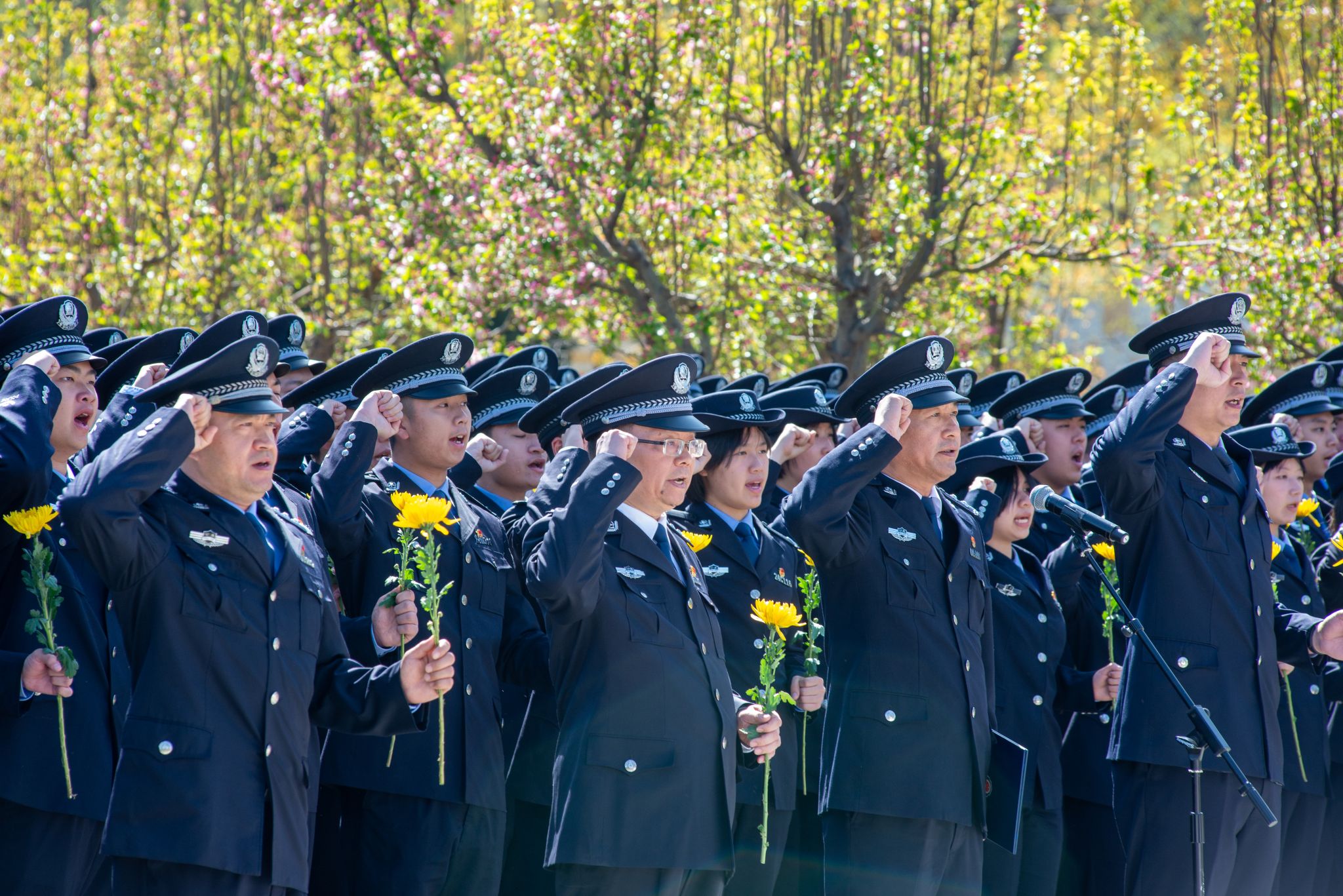 活动中,学生代表宣读了《致全国公安院校学生倡议书》,呼吁全国公安院校预备警官时刻牢记习近平总书记的重要嘱托,大力弘扬公安英烈精神,矢志不渝做党和人民的忠诚卫士,为建设更高水平平安中国贡献青春力量。集体宣誓后,全体人员合唱中国人民警察警歌,并向公安英烈献花致敬。