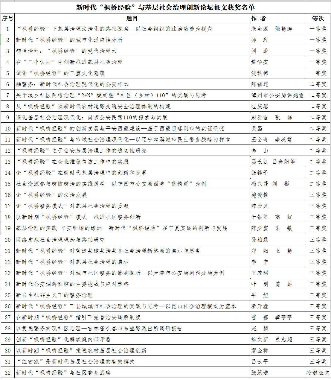 为切实落实公安部《关于全国公安机关坚持发展新时代“枫桥经验”的意见》精神,创新基层社会治理,推动平安中国、法治中国建设,2019年9月,公安部公安发展战略研究所面向全国公安机关、公安院校以及科研机构开展“新时代‘枫桥经验’与基层社会治理创新”主题征文活动,以进一步深化学习贯彻习近平总书记“把‘枫桥经验’坚持好、发展好”的重要讲话精神。