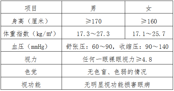 3.皮肤外观:无呈现明显异常的皮肤疾病和其他传染性或难以治愈的皮肤病(如:白癜风、银屑病等),无血管瘤、斑痣等,着短袖T恤时手臂裸露部位和腿部(膝盖以下)无明显疤痕、胎记、色素斑等,无其他大面积的疤痕挛缩等,无文身(在身体任何部位,烫成、绘成、刺成的,带颜色或与肤色接近的花纹、图形等)和影响功能的身体瘢痕;