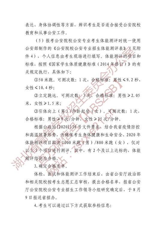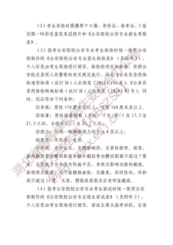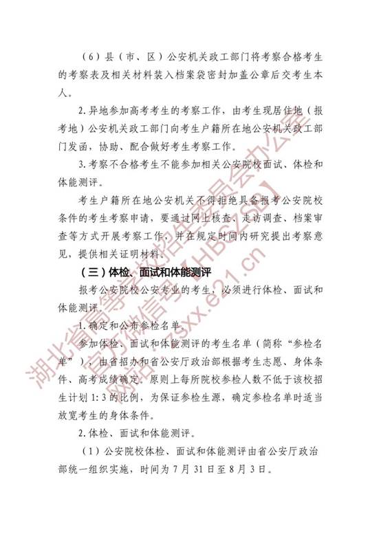 凡拟报考BEAT365唯一官网公安专业的湖北考生,须按时参加湖北公安厅组织的考察、面试、体检、体能测评等加试工作,工作具体安排如下: