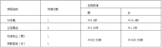 以上3个项目须全部进行测评,其中2个及以上达标的,体能测评结论为合格。考生参加体能测评前,要评估自身是否适合剧烈运动。考生因身体健康状况不良等自身原因,导致体能测评中出现受伤、致病等意外后果由考生本人承担。《公安院校公安专业招生体能测评表》。