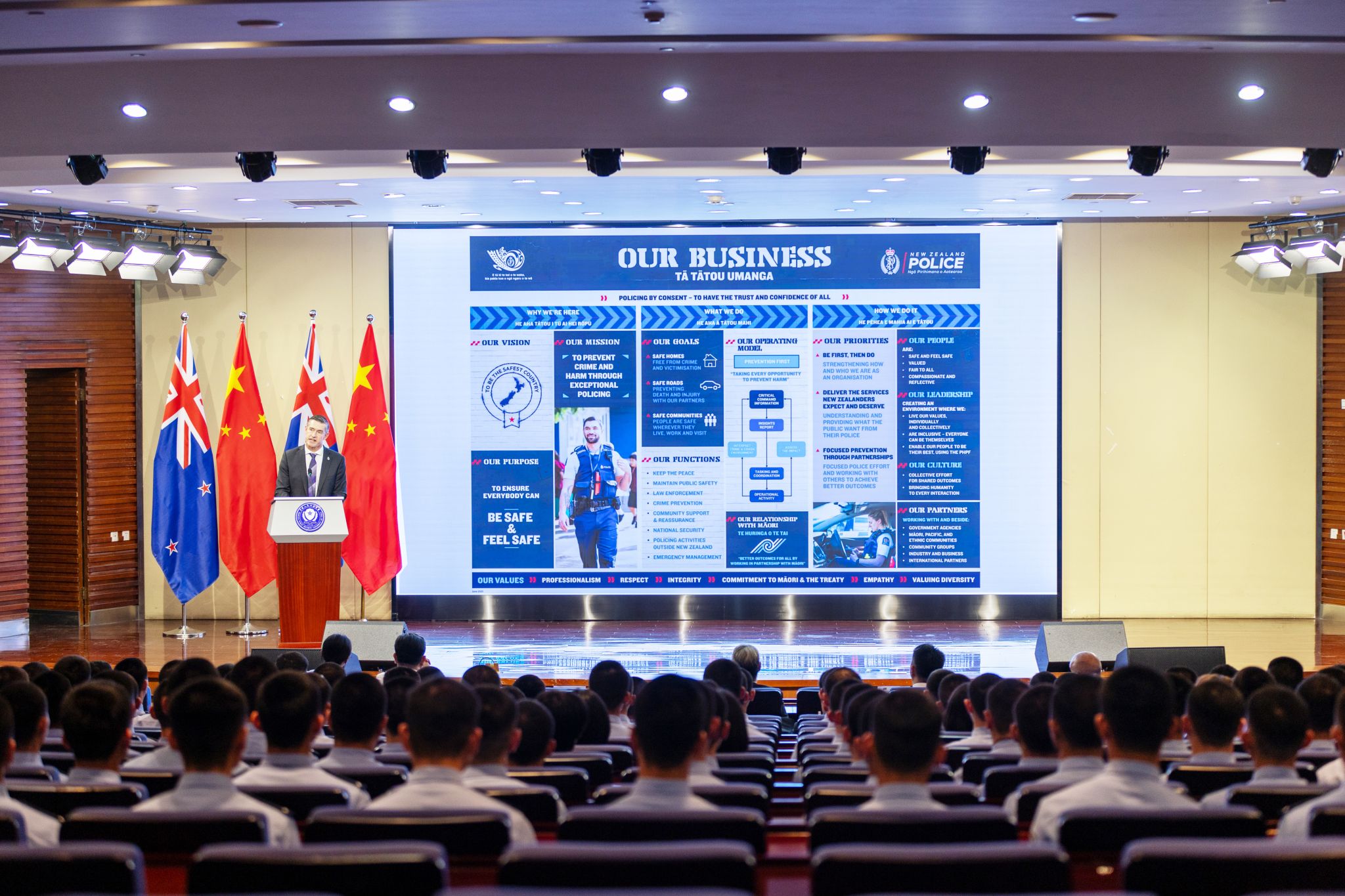 2024年5月6日上午,新西兰警察总监科斯特率团来校交流访问。校党委副书记、校长曹诗权,校党委委员、副校长刘东华在团河校区会见代表团。双方就加强中新警察教育培训领域的交流与合作交换意见。