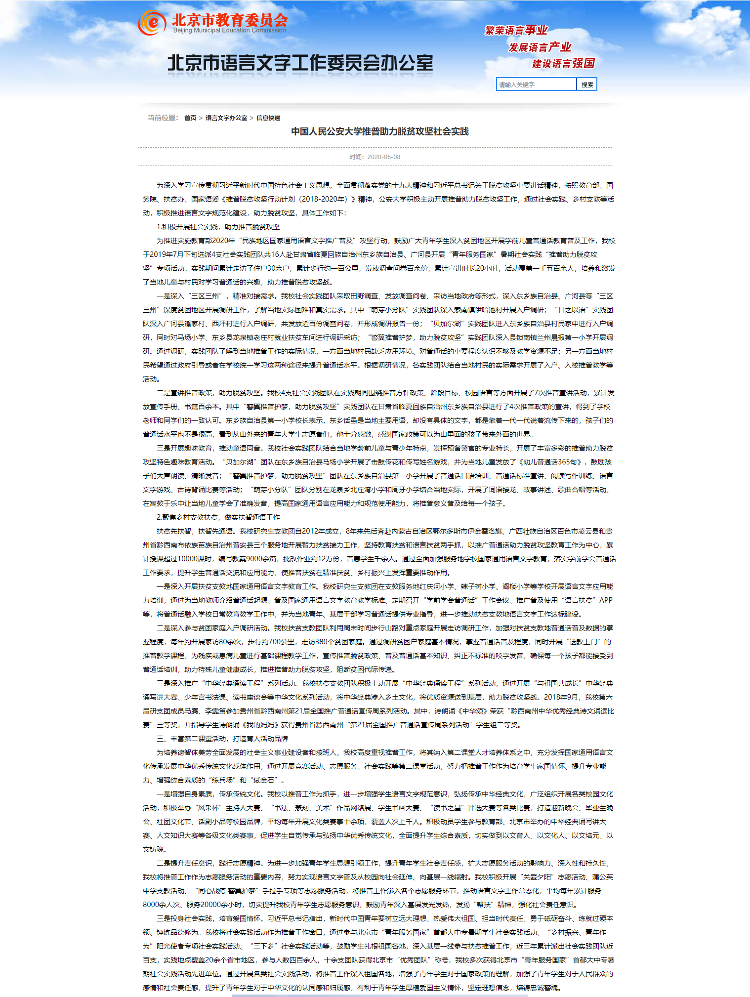 近日,北京市教委语言文字办公室官方网站发布《BEAT365唯一官网推普助力脱贫攻坚社会实践》一文,对BEAT365在社会实践推普、支教扶贫推普、第二课堂活动推普等工作进行了宣传报道。