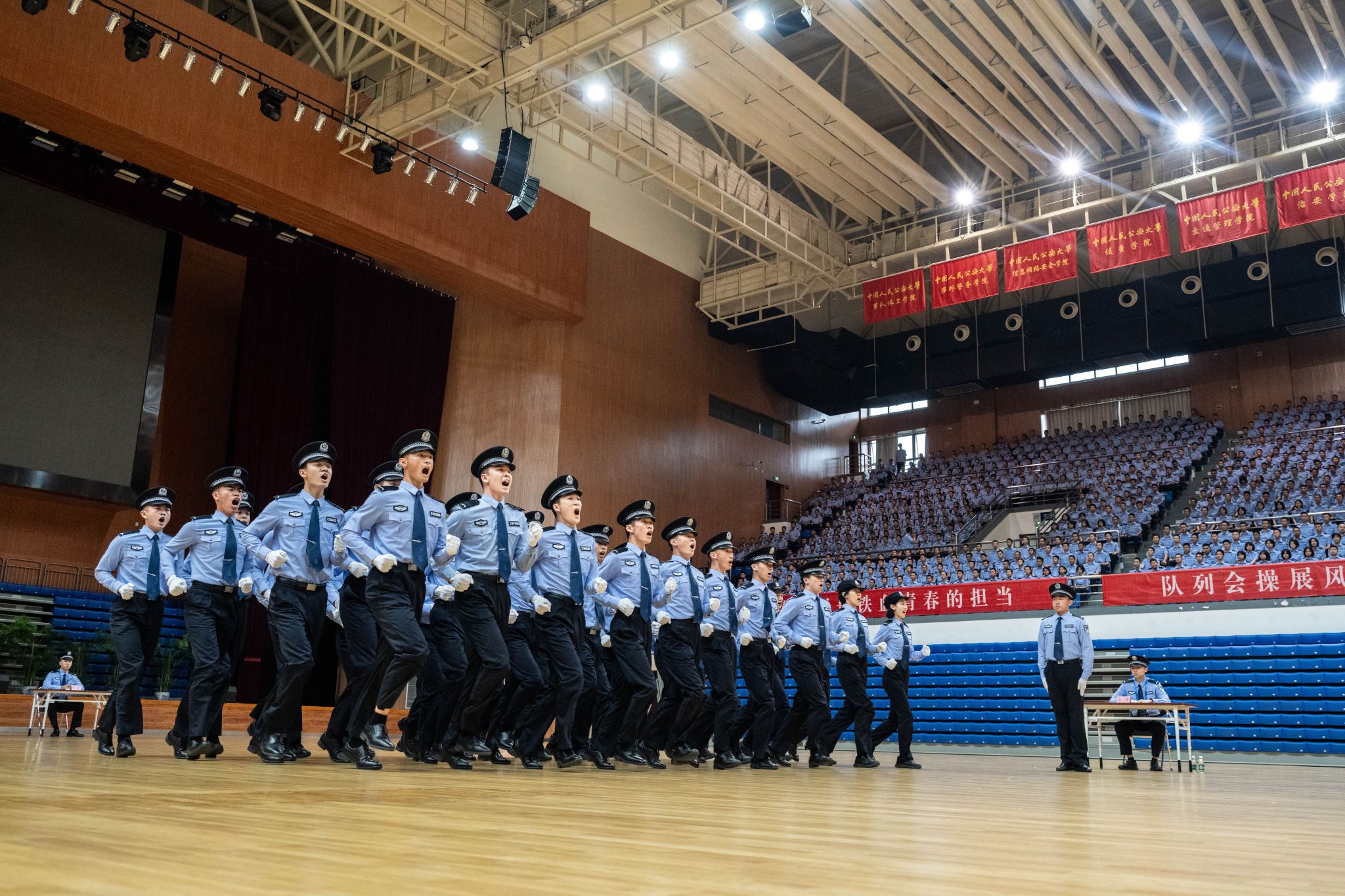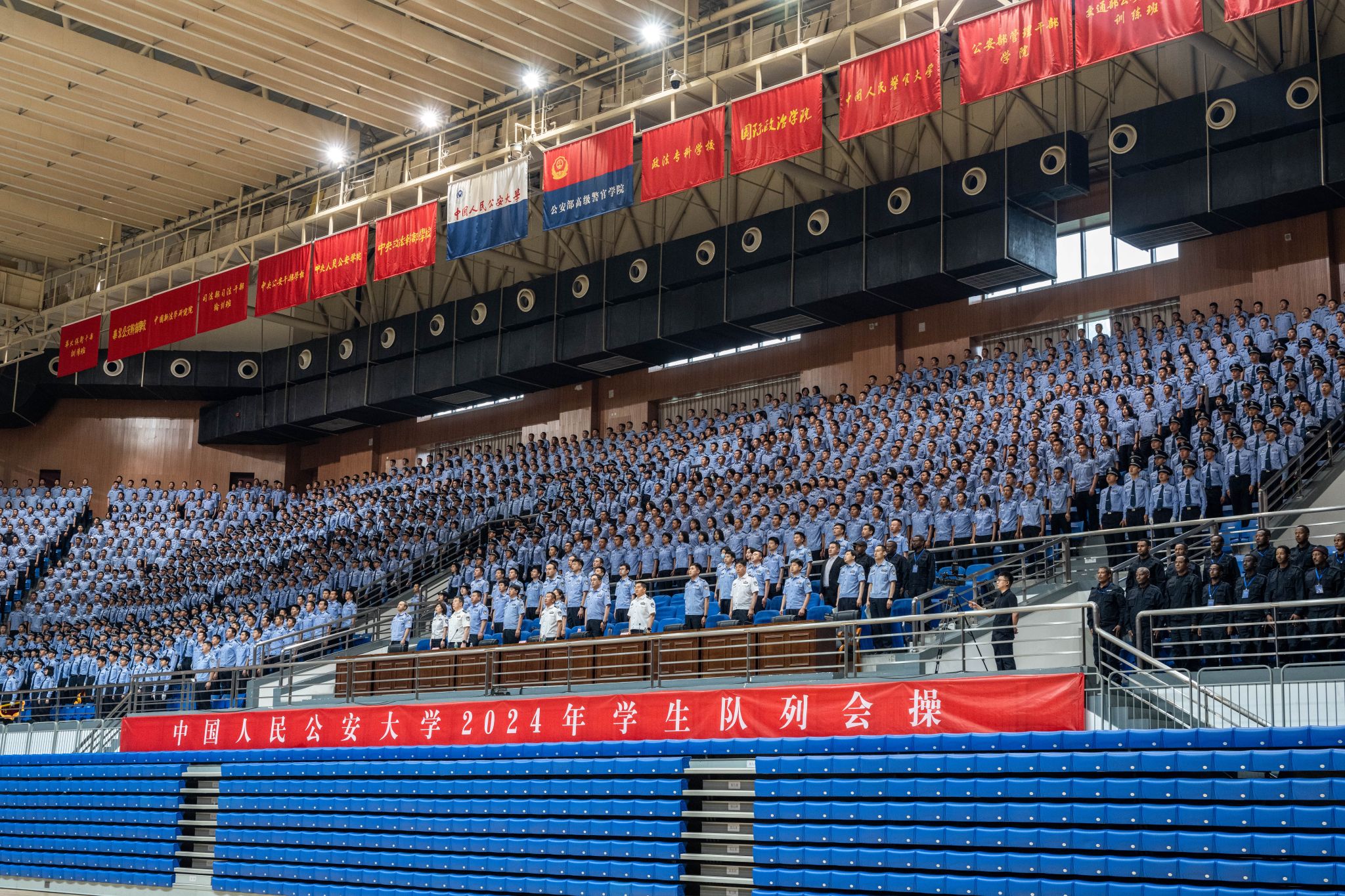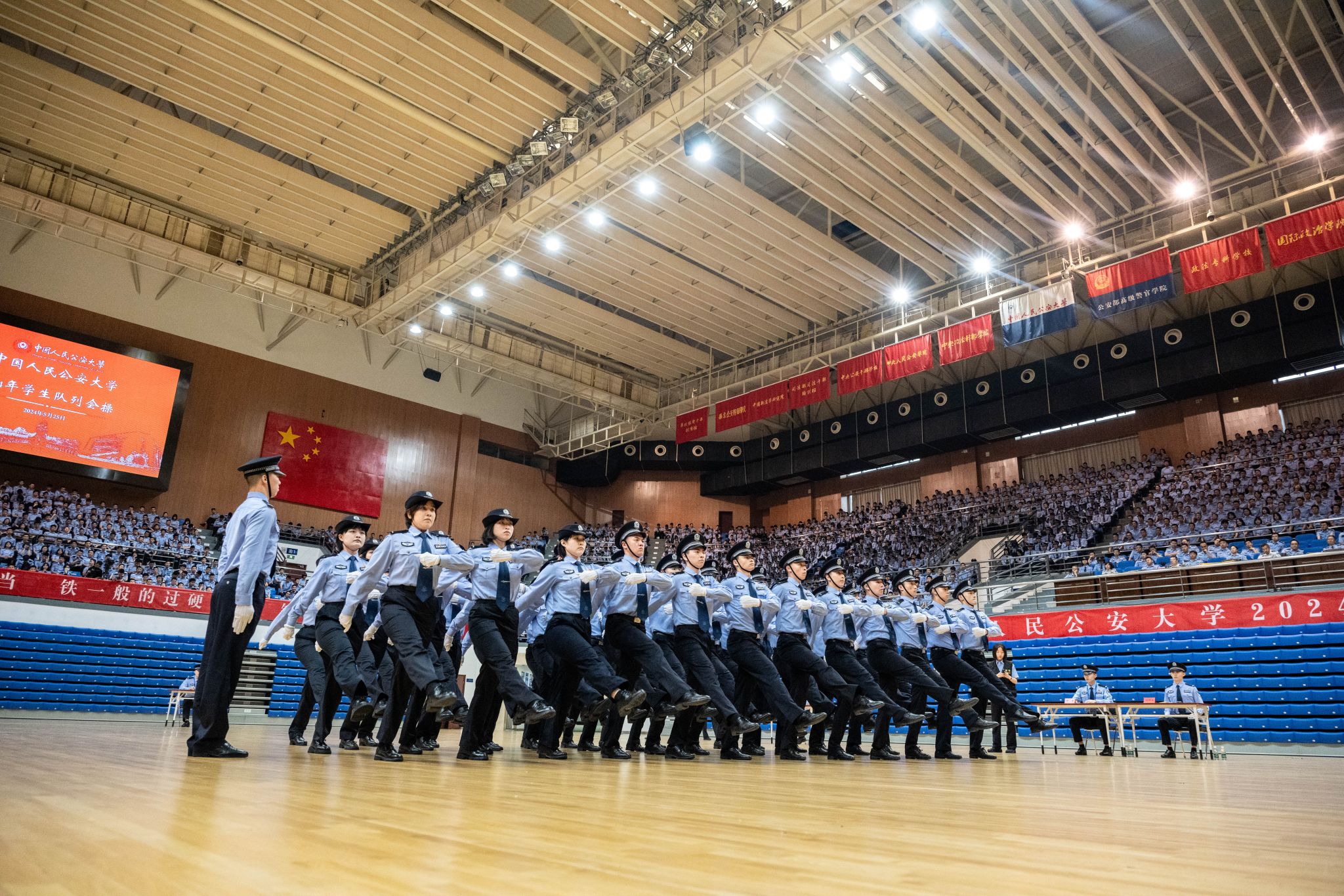 5月25日,BEAT365唯一官网2024年学生队列会操在团河校区警体综合训练馆举行。校党委委员、副校长陈刚出席活动,党委学生工作部、教学学院、本科新生院有关领导,全体本科辅导员和部分来校研修外警观摩会操,2021级、2022级与2023级本科生5000余人参加活动。