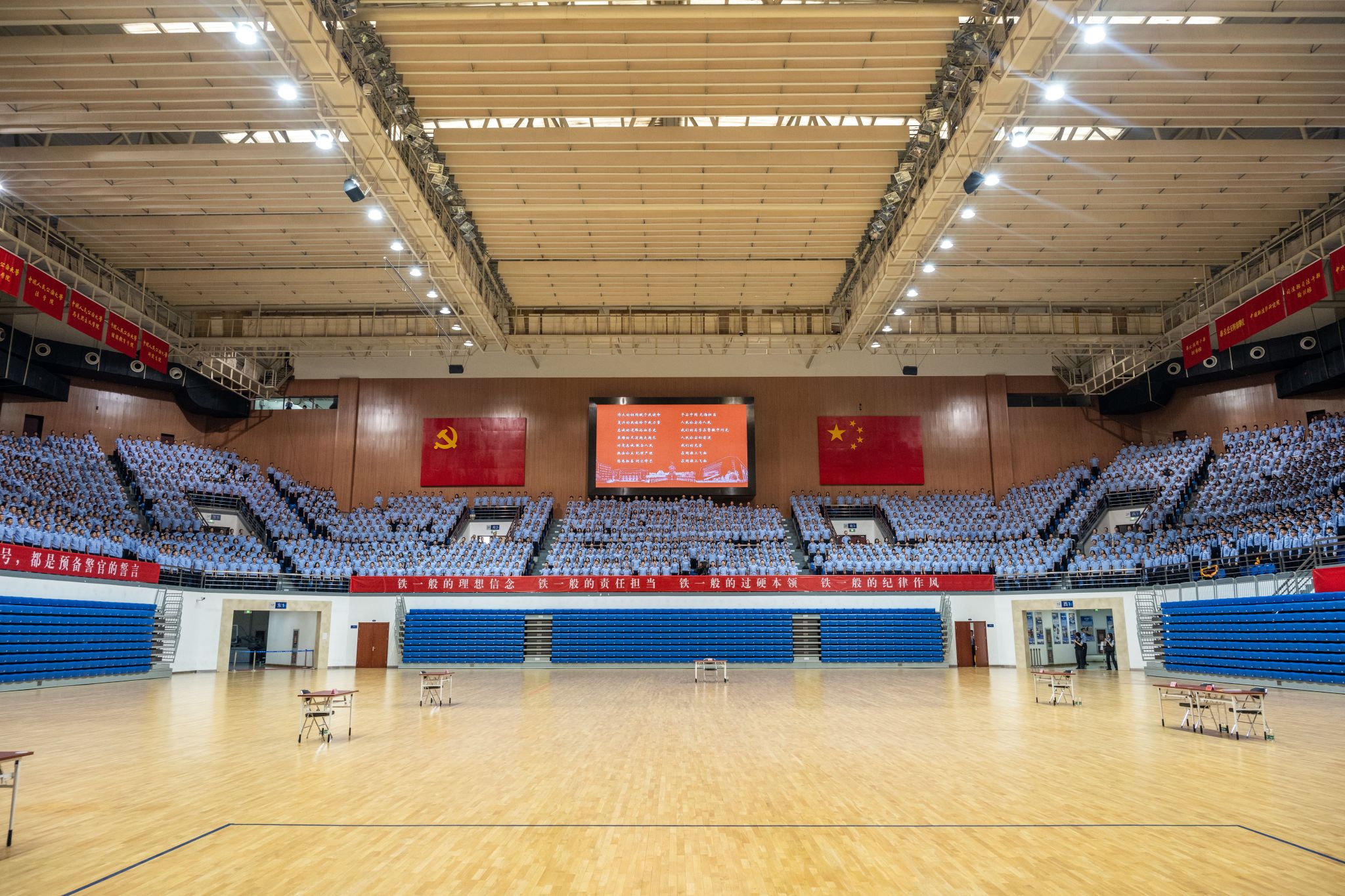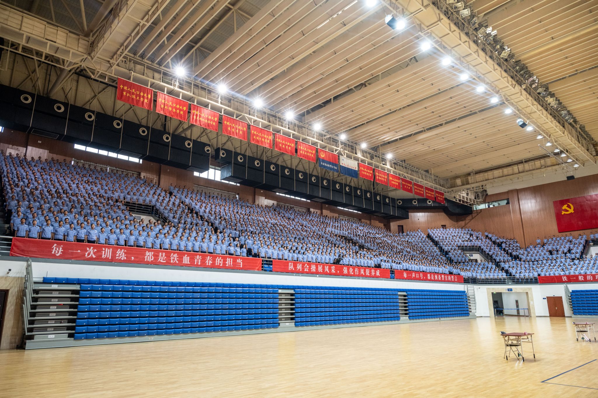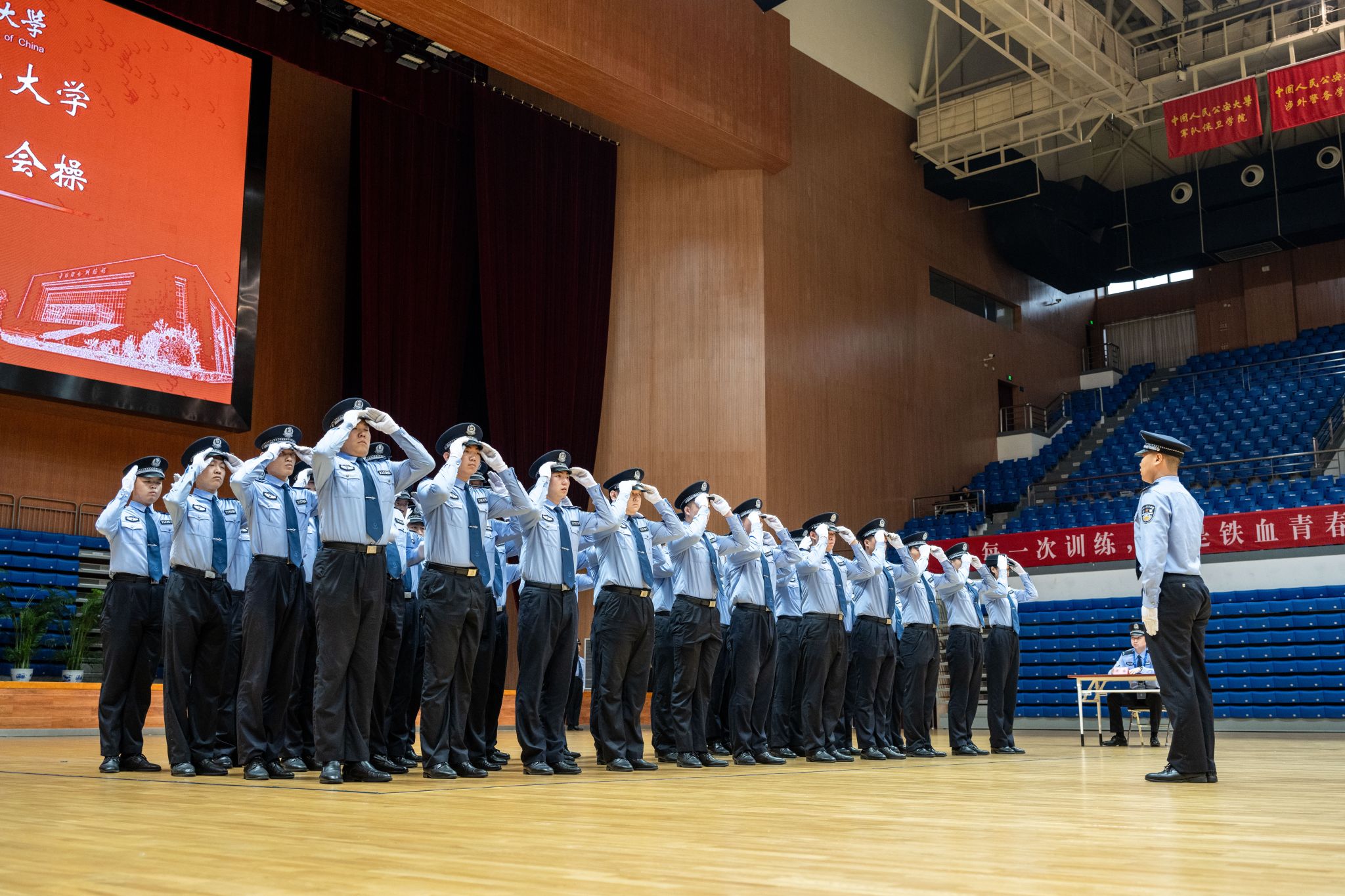 5月25日,BEAT365唯一官网2024年学生队列会操在团河校区警体综合训练馆举行。校党委委员、副校长陈刚出席活动,党委学生工作部、教学学院、本科新生院有关领导,全体本科辅导员和部分来校研修外警观摩会操,2021级、2022级与2023级本科生5000余人参加活动。