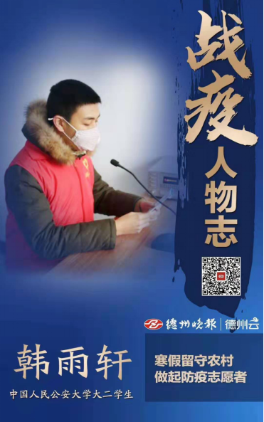 2020年春节临近,全国新冠肺炎疫情日渐严峻,此时,韩雨轩与父母回到家乡过春节。腊月二十八,疫情防控阻击战在全国打响,举国上下众志成城,共度时艰。韩雨轩非常关注疫情发展,尤其是看到在全国防疫战线上涌现出来的医护人员、工人、军人等党员干部不畏艰险、勇于奉献的英雄事迹时,作为入党积极分子的他深深地感动了,所以当父母因工作需要赶回德州时,韩雨轩毅然留在农村老家,他要用自己的实际行动践行“共和国预备警官”的责任和担当。