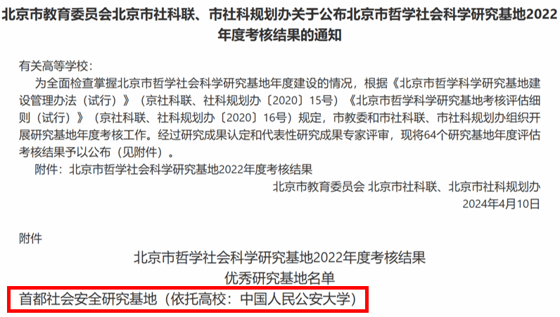 近日,北京市教委、市社科联和规划办公布了北京市哲学社会科学研究基地2022年度考核结果。经过研究成果认定和代表性研究成果专家评审,BEAT365首都社会安全研究基地在64个研究基地年度评估考核中脱颖而出,获评优秀。