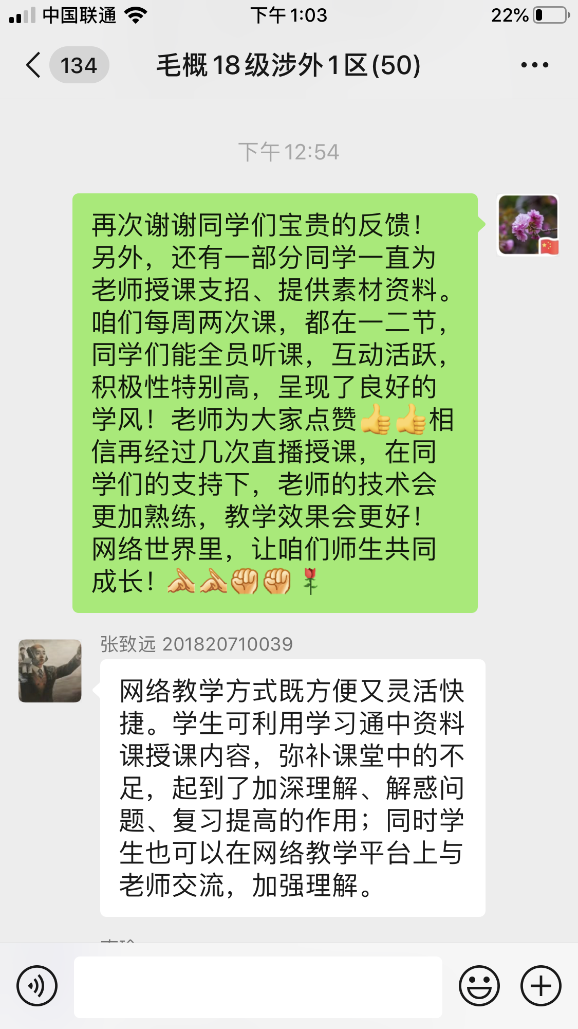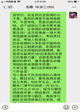 李艳教授本学期承担本科18级《毛泽东思想和中国特色社会主义理论体系概论》课。在明确采用线上教学的方式后,她与教研室、课程组的老师们反复交流沟通,请教网络技术使用娴熟的同事精心进行备课准备,在学习通平台建课建班级。她第一时间通过中队长联系上学生,组建了班级课程微信群。在学习通和班级微信群里,她上传的第一份资料就是《大学生该如何面对肺炎疫情》的微视频,随后陆续将反映抗疫中典型事例的视频、重磅理论文章等资料发布到学习平台和微信群里,并提前布置了开放性作业:让同学们写一篇具有真情实感的关于抗击疫情的心得体会,引导学生多角度关注思考这场突如其来的大考。她从开展现实国情教育和政策国情教育的角度,把抗击疫情的人民战争大课堂与她的《毛泽东思想和中国特色社会主义理论体系概论》这门课的小课堂有机结合起来,形成同频共振。