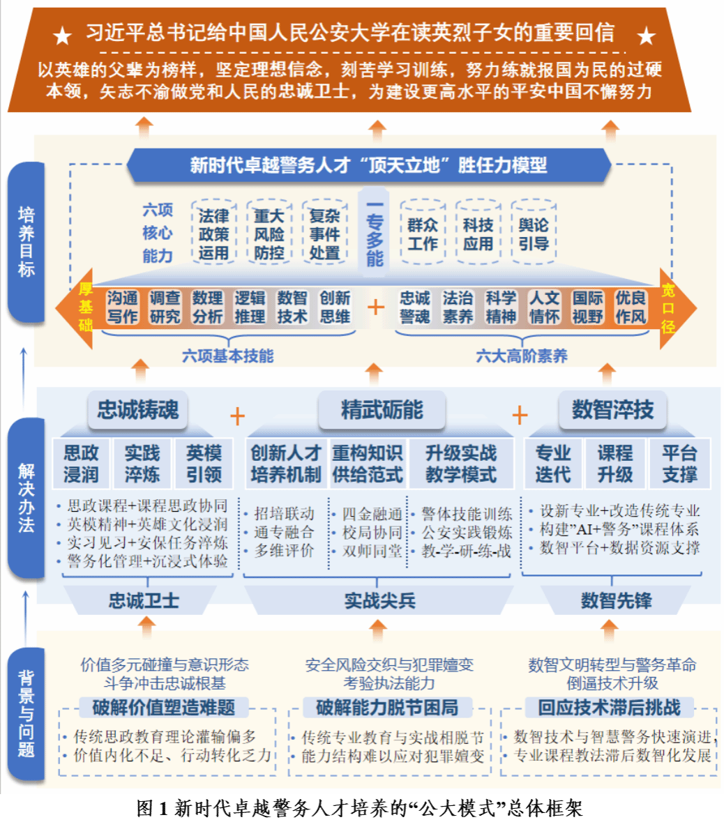 学校坚持以习近平新时代中国特色社会主义思想为指导,深刻把握新时代新形势新需求,直面“价值多元碰撞与意识形态斗争冲击忠诚信念、安全风险交织与犯罪嬗变考验执法能力、数智文明转型与警务革命倒逼技术升级”等挑战,自2013年起系统谋划、持续探索,依托多项国家级与省部级教改项目,于2017年完成并实施《综合改革方案》《办学指引》,确立服务平安中国战略需求、扎根公安实战现实需求、适配数智文明未来需求的育人定位,系统构建“忠诚铸魂、精武砺能、数智淬技”三位一体育警模式,着力培养“忠诚可靠、专业精通、文武兼备、作风顽强”的新时代卓越警务人才,持续服务更高水平平安中国建设。 成果内容与解决的主要教学问题如下: 1.以“忠诚铸魂”破解价值塑造难题:传统公安思政教育存在理论灌输多、价值内化不足、行动转化乏力等问题。学校构建“思政浸润、英模引领、实践淬炼”三维铸魂体系,思政课程与课程思政协同、英模精神与英雄文化感召、公安实习见习与安保实践淬炼融合,实现忠诚教育从抽象转向具象,有效锻造政治绝对可靠的“忠诚卫士”。 2.以“精武砺能”破解能力脱节困局:传统公安专业教育存在知识传授与实战需求脱节、能力结构难以应对犯罪嬗变等问题。学校完善“招培联动、通专融合、多维评价”机制,推动四金建设、校局共育、双师同堂,强化“跑擒驾泅射”警体技能训练与公安实战锻炼,构建“教学研练战”融通的能力本位培养模式,系统培育本领过硬的“实战尖兵”。 3.以“数智淬技”回应技术滞后挑战:数智技术与智慧警务快速演进,专业、课程与教法等转型滞后于数智化发展。学校构建“专业迭代、课程升级、平台支撑”数智赋能机制,布局数智新专业,升级传统专业,构建“AI+警务”课程体系,搭建数智实验平台,有力培养引领新质战斗力的“数智先锋”。